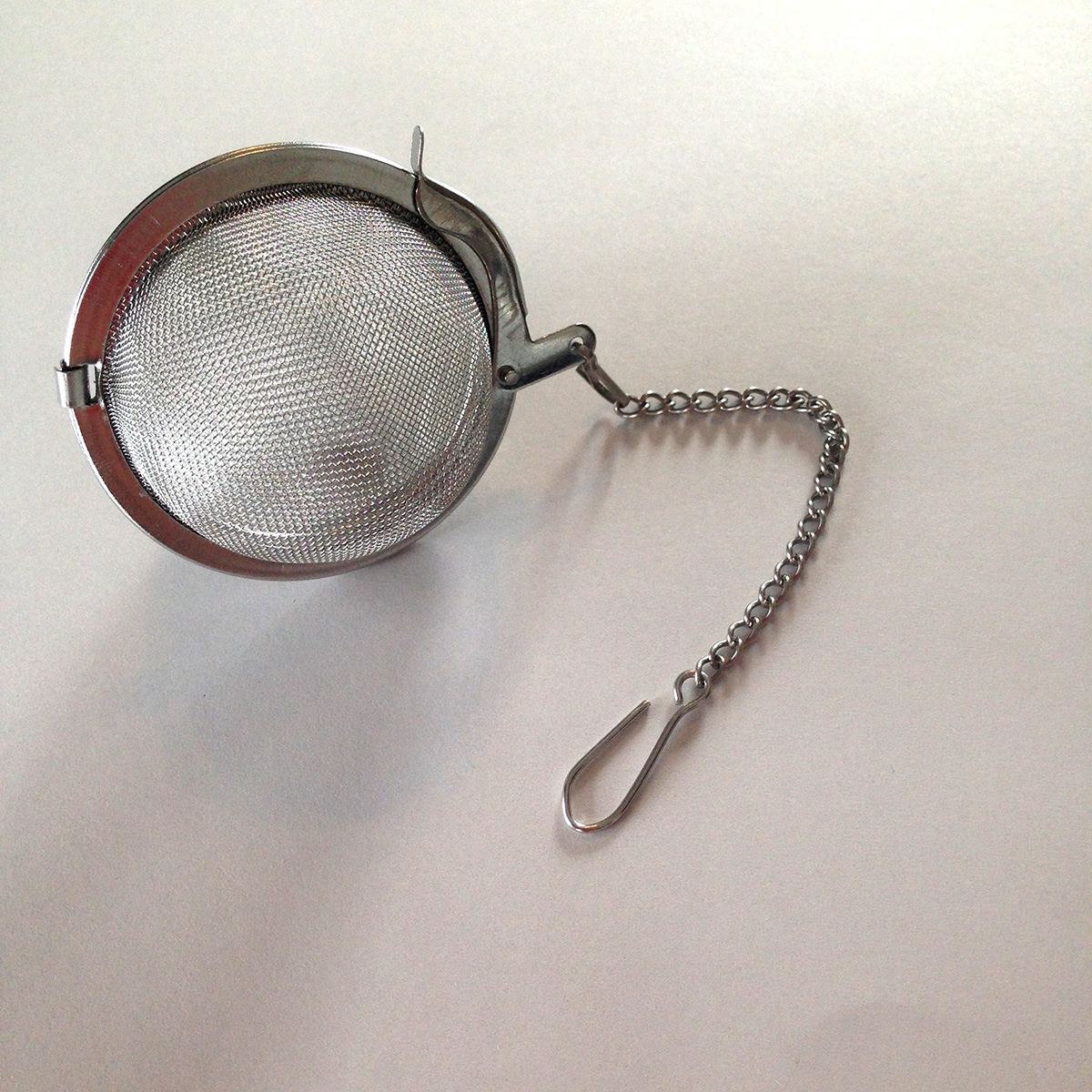 Stainless steel ball opens in the middle and closes with a latch. A chain and hook is attached so it can be hung off the rim of the cup or mug. This ball will hold approximately 1 teaspoon.