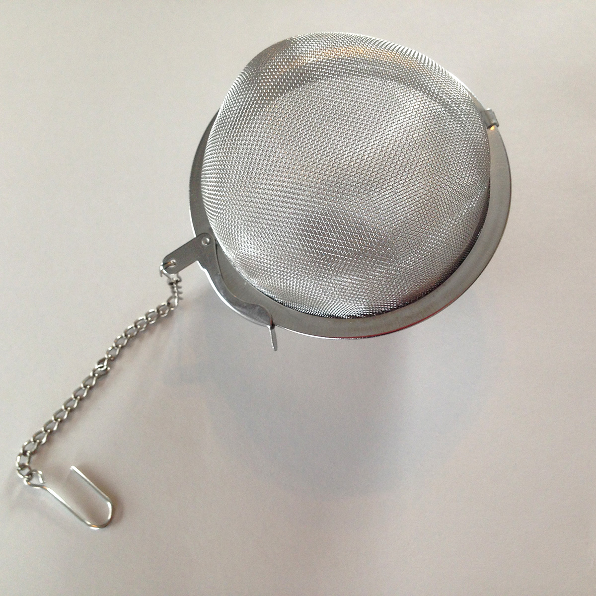 Stainless steel ball opens in the middle and closes with a latch. A chain and hook is attached so it can be hung off the rim of the cup or mug. This ball will hold approximately 6-9 teaspoons.